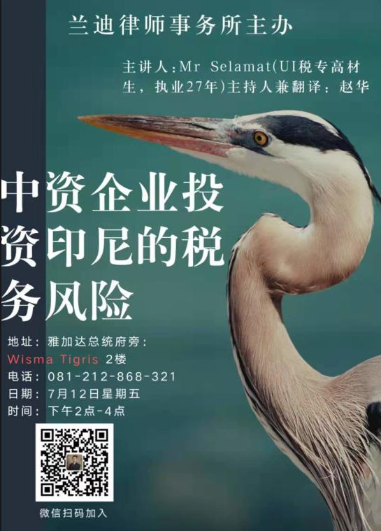 此次讲座由印尼资深税务专家 Mr. Selamat 主讲(执业27年),赵华律师全程翻译。您还在等什么呢?即刻报名,抢占免费名额。