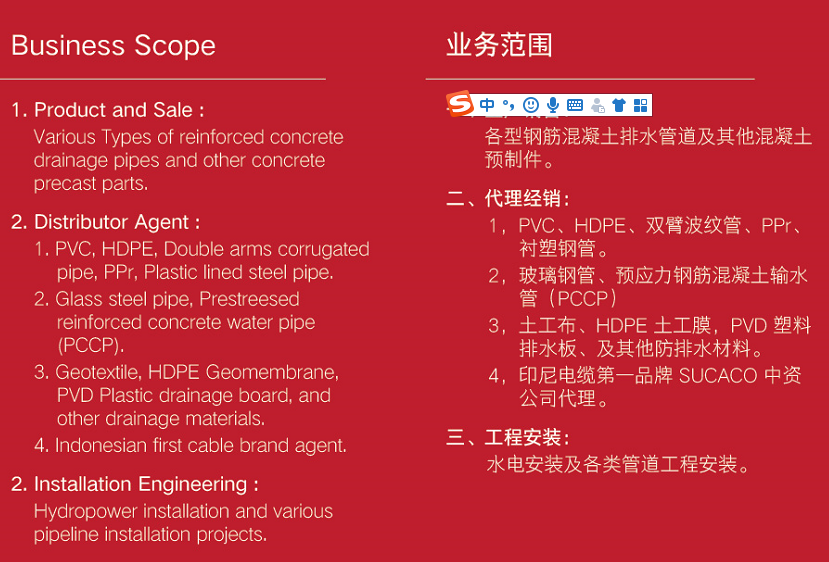 印尼双狮有限公司(PT.ShuangshiIndonesia)印尼双狮有限公司工厂坐落于中印经贸合作区内,占地20000平的厂区专注于生产:1,水泥涵管,U型槽,箱涵,隔离墩,路沿石,围墙板等其他水泥预制构件。 2,印尼双狮也是联塑在印尼代理商中,面对中资企业的“唯一”一家市政管道“一级”经销商。销售有:HDPE给排水管、PVC给排水管、钢丝网骨架聚乙烯复合管(PSP)、HDPE双臂波纹管 、双臂加筋波纹管(FRPP)、衬塑钢管等管道。 其他业务: 3:玻璃钢管,预应力钢筋混凝土输水管(PCCP) 4:土工布,HDPE 土工膜,PVD塑料排水板,真空膜及其他防排水材料。 凭借“双狮”在印尼发展多年积累下的丰富经验及良好信誉,已多次为印尼本地的和在印尼的中资大中型项目提供相关优质产品及配套服务。