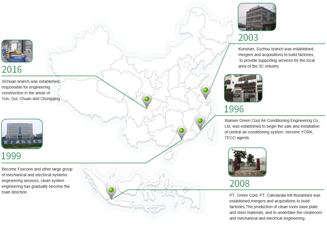 绿冷机电工程创立于1996年,20年来公司专注于净化无尘系统(包括医院、药厂、食品厂),工业机电工程,中央空调系统设计、施工、安装,并在智能手机、高端喷涂、新能源材料、医疗食品生产领域,具备成熟的经验积累与专业技术,公司拥有5家下属公司及海外公司,采用设计及施工不对外发包的过程控制方式,致力于设计、服务、安装为一体的综合服务商。