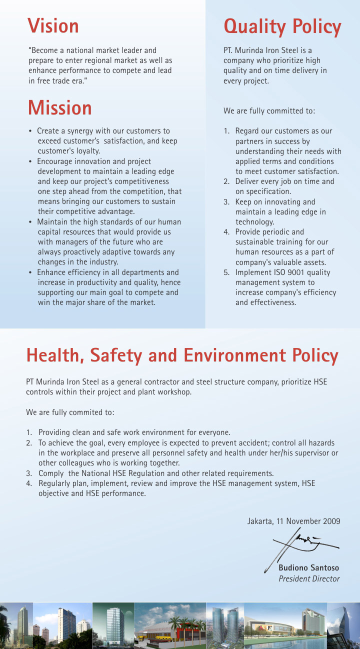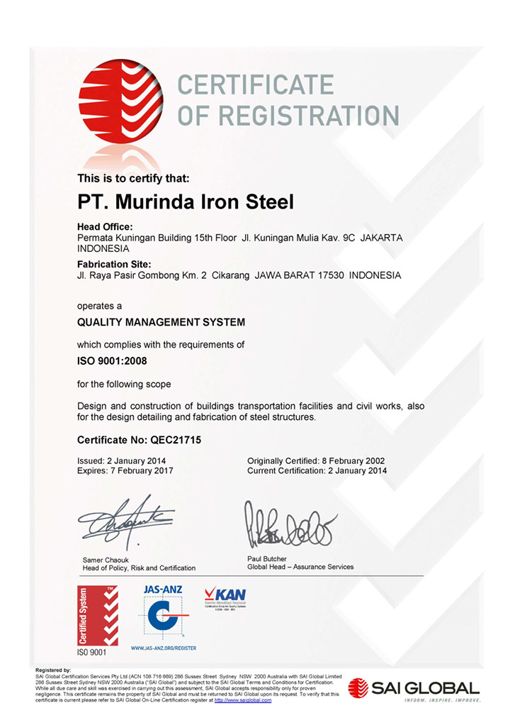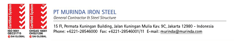 穆林达钢构PT Murinda Iron Steel是建筑领域的领导者,在印度尼西亚建筑服务领域拥有40多年的经验,其在总承包商和钢结构中的运营旨在满足客户的需求。 自1974年6月28日成立以来,该公司业绩举不胜数。从住房项目到高层建筑和商场,如WTC Mangga Dua贸易中心,面积235,000平方米,雅加达格林菲尔德的“办公室,工厂,仓库和外部工程”等大型项目,PT HM Sampoerna Tbk,总面积580,000平方米,Schlumberger Jakarta Integration基地 - 主楼建筑工程占地面积93,000平方米,位于雅加达SCBD Lot 10的办公楼开发区,地下6层,塔楼40层;以及一个小到40吨钢铁的工厂项目,这个巨大的工业工厂项目规模达到10000吨以上。
