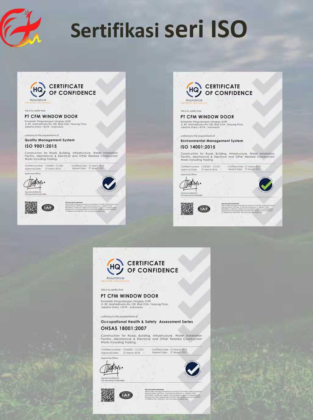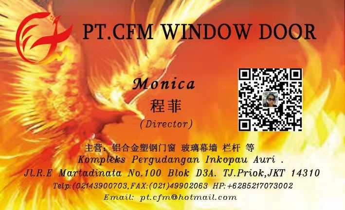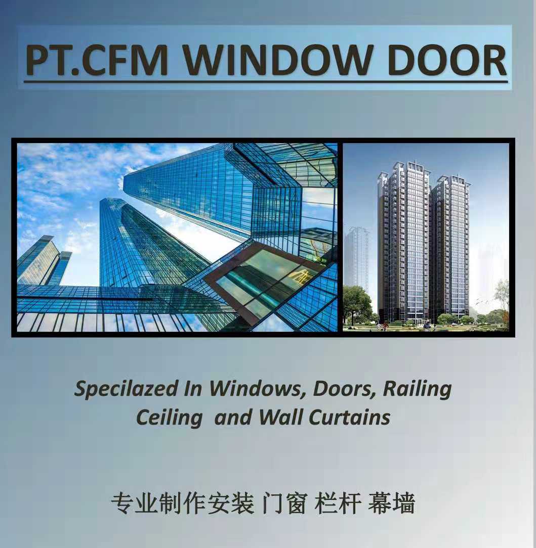 CFM 是一家国际公司。该公司诞生于董事长程菲女士的一个梦想——打造安全,节能,美观的门窗品牌。 名字来源: 程菲梦 cheng fei meng(简称CFM. Cheng fei ‘s dream )。 CFM前身是PT. CAHAYA FAJAR MEREKAH. 该公司由程菲女士和本土PT. SUMBER DAYA AGUNG 合作创办于2014年9月3日。 为了门窗事业的更进一步发展,于2017年7月27日,程菲女士注资收购原公司,变更为PT.CFM WINDOW DOOR公司,继续为印尼的建筑业添砖加瓦,续写辉煌。 本公司一直秉承诚信经营,客户满意的宗旨,致力于成为印尼最出色的铝合金门窗公司。选择CFM,就是选择放心,选择品质,选择成功,期待与您合作!