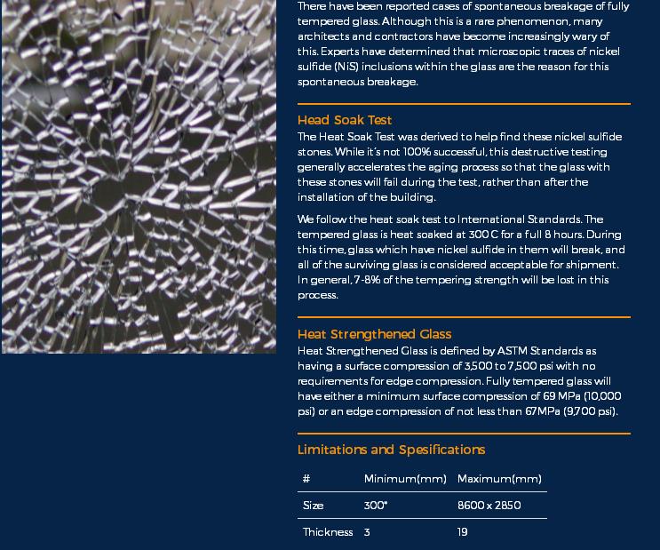 Heat Soak Test & Heat Strengthened Glass热浸&热强化玻璃:规格为 300~ 8600 x 2850mm,厚度为3 ~19mm。