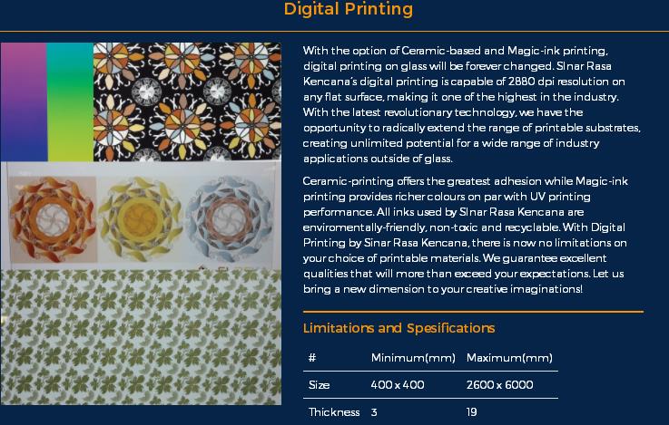 Digital Printing 数码印刷玻璃:规格为400*400~2600*6000mm,厚度为3~19mm。