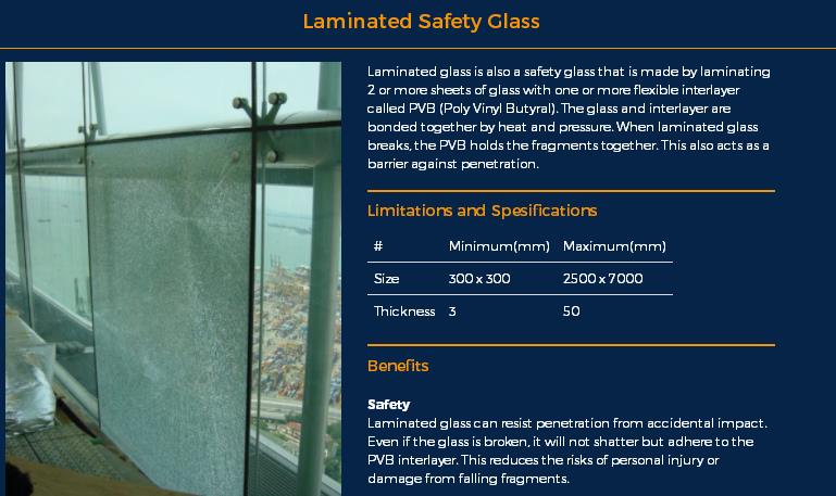 Laminated Safety Glass 层压安全玻璃: 规格为300*300~2500*7000mm,厚度为3~50mm。