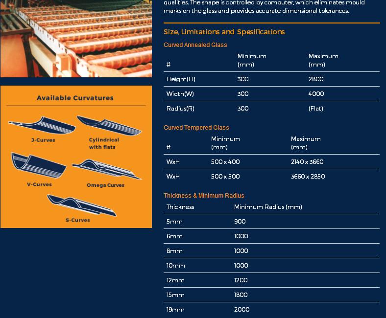 Curved Glass & Curved Tempered Glass 曲面玻璃和曲面钢化玻璃:Sinar Rasa Kencana的弧形钢化玻璃采用Glasstech的高级弯曲和回火系统制造。生产的国际玻璃符合断裂标准,同时保持优异的光学质量。形状由计算机控制,可消除玻璃痕迹并提供精确的尺寸公差。