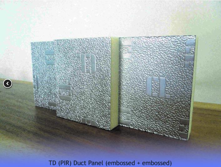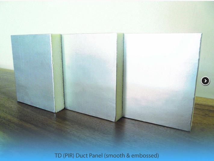 2. TD (PIR)风管面板(光滑及压花)厚度20mm,两侧均涂有铝箔压花,另一侧光滑,外加耐腐蚀涂层。