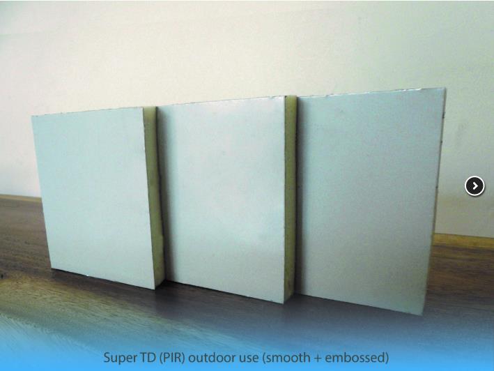 3.超TD (PIR)户外使用(光滑+浮雕)厚度20mm,一面涂厚铝箔,一面涂耐腐蚀漆,另一面涂铝复合色。