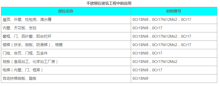 不锈钢在建筑工程中得应用部位见下表: