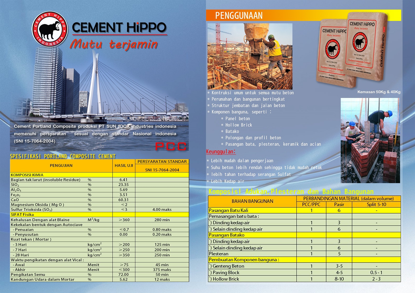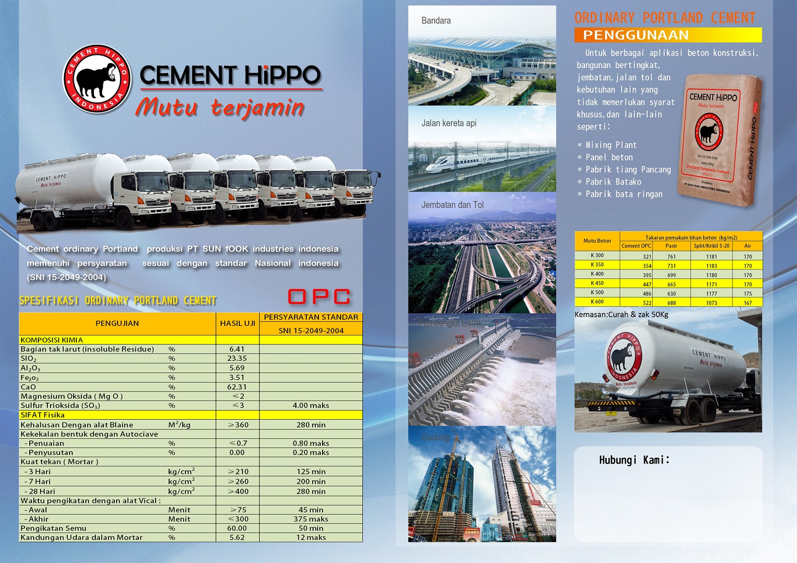 PT. Sun Fook Industries Indonesia是一家水泥制造公司,其商标为CEMENT HIPPO,成立于2013年1月22日,旨在满足印度尼西亚的高品质水泥需求,因此我们后来采用ISO 9001:2008质量管理体系作为标准操作程序 我们通过这个我们可以最大化生产能力,每年达到120万吨。