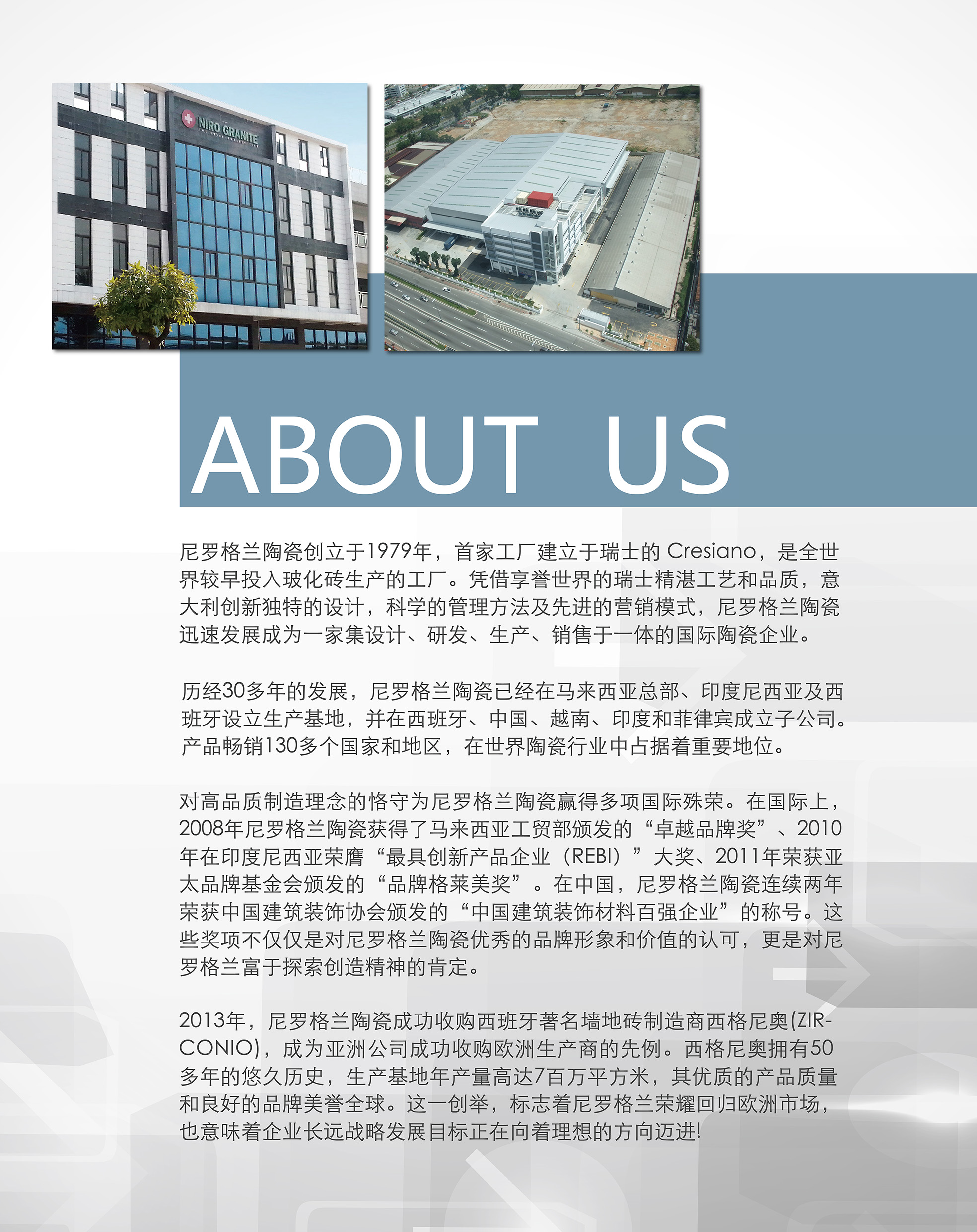 尼罗格兰集团于1979年在瑞士创立,总部设于马来西亚,是全世界最早投入玻化砖生产的三家工厂之一。现拥有尼罗格兰陶瓷、西格尼奥陶瓷、欧瑞恩卫浴等品牌,拥有马来西亚、印度尼西亚、西班牙三家生产基地,并在中国,越南,印尼、西班牙、菲律宾等地成立了子公司,拥有世界先进的生产设备及强大的产品研发能力,是集设计、研发、生产、销售于一体的国际陶瓷企业。对高品质制造理念的恪守为尼罗格兰赢得多项国际殊荣,产品畅销130多个国家和地区,在世界陶瓷行业中拥有极高的国际声誉。