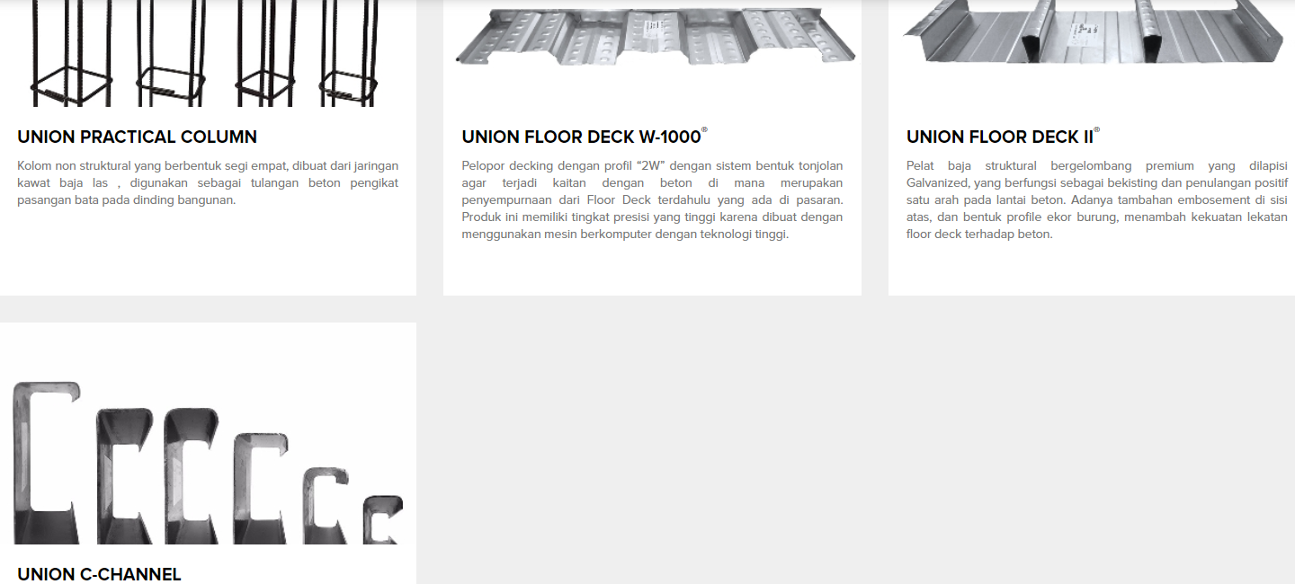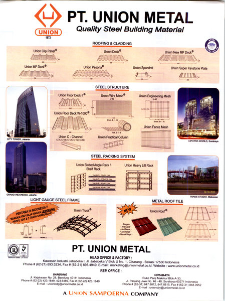 PT. union Metal是一家生产高品质钢结构建筑材料的制造公司。该公司成立于1971年1月20日,位于雅加达北部Jalan Ancol VII No. 3 Ancol Barat的1.2公顷土地上。 我们的使命是:“在国内市场上实现钢结构建筑材料的自给自足。 “为了实现本地产品的自给自足,我们已成为印度尼西亚生产钢制建筑材料的先行者,如LouvreW indows,Slotted Angle,Keystone Plate和Sliding Door Rail,我们将其命名为Conventional Products。 为了应对印度尼西亚的快速发展,我们在1982年进行了扩建,以生产瓦楞屋顶板,C型槽和地板等工业产品。在1996年,我们购买了计算机化的新机器,它们是: 奥地利丝网焊接机 来自澳大利亚的夹板卷成型机 来自澳大利亚的地板辊成型机 1996年,我们在位于Jl.Jababeka Industrial Estate的5公顷土地上建造了2.5公顷的新办公室和工厂。 JababekaV Block U No. 1,Cikarang - Bekasi,West Java。 1998 - 1999年,我们通过ISO 9002提高产品和服务质量,实现内部整合,愿景是:“通过优质产品和服务创造最佳客户交付价值,成为建材行业的领导者” 。 ” PT.union Metal是第一家获得ISO 9002:1994屋顶板,金属丝网和地板甲板制造质量管理体系认证的制造商。