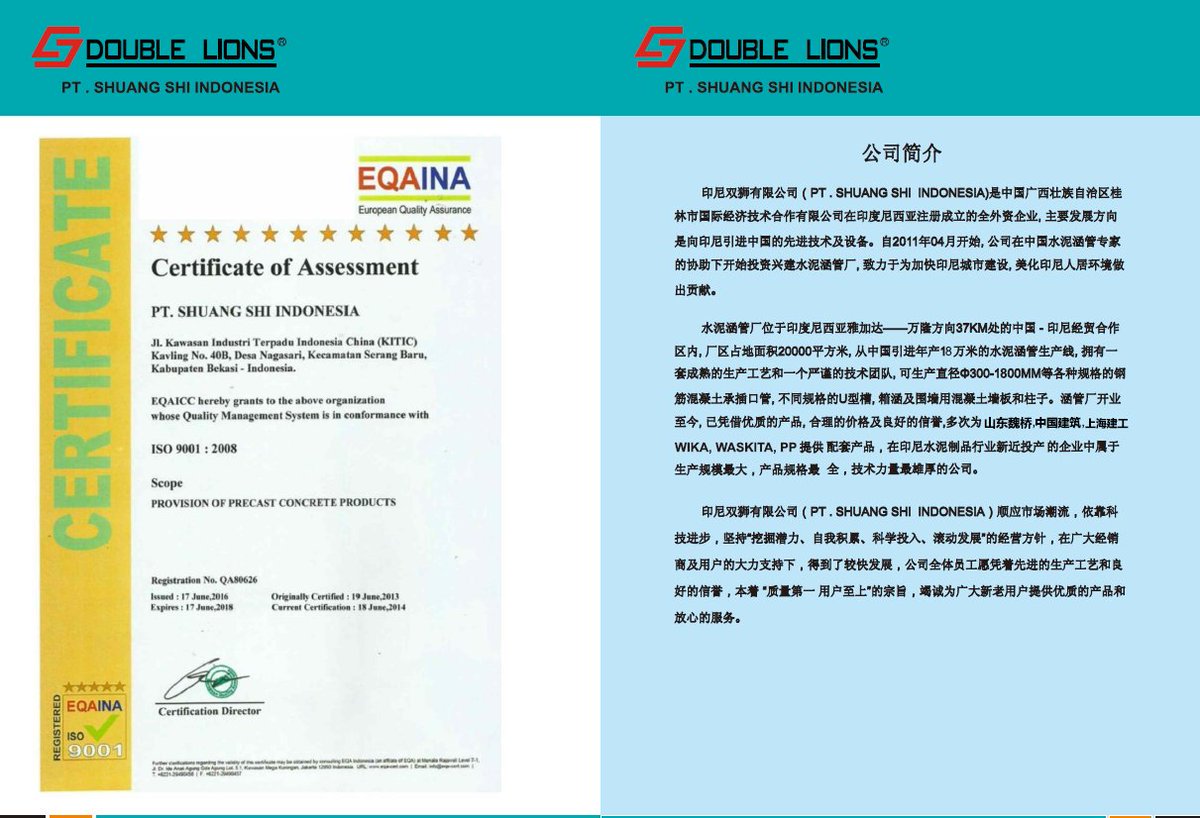 印尼双狮有限公司(PT.ShuangshiIndonesia)印尼双狮有限公司工厂坐落于中印经贸合作区内,占地20000平的厂区专注于生产:1,水泥涵管,U型槽,箱涵,隔离墩,路沿石,围墙板等其他水泥预制构件。 2,印尼双狮也是联塑在印尼代理商中,面对中资企业的“唯一”一家市政管道“一级”经销商。销售有:HDPE给排水管、PVC给排水管、钢丝网骨架聚乙烯复合管(PSP)、HDPE双臂波纹管 、双臂加筋波纹管(FRPP)、衬塑钢管等管道。 其他业务: 3:玻璃钢管,预应力钢筋混凝土输水管(PCCP) 4:土工布,HDPE 土工膜,PVD塑料排水板,真空膜及其他防排水材料。 凭借“双狮”在印尼发展多年积累下的丰富经验及良好信誉,已多次为印尼本地的和在印尼的中资大中型项目提供相关优质产品及配套服务。